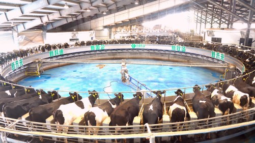 奶牛在重型轉(zhuǎn)盤擠奶機上擠奶。本報融媒體記者 邢棟 攝